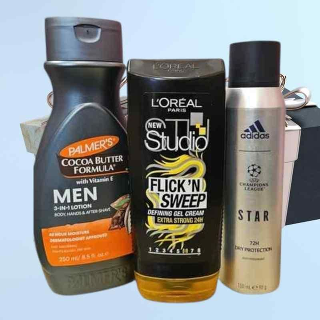 The Men’s Grooming Essentials Gift Set combines hydration, freshness, and style in a convenient and thoughtfully curated package. Featuring Palmer’s Cocoa Butter 3-in-1 Lotion, Adidas Champions League Star 72h Deodorant, and L’Oréal Studio Flick’ N Sweep Extra Strong Hair Gel Cream, this set provides everything a man needs to feel confident, refreshed, and well-groomed.