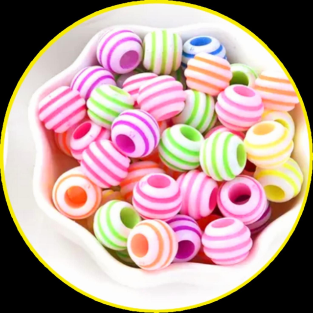 Bright and playful round beads featuring a colourful striped pattern in shades of pink, purple, green, orange, yellow, and blue. Made from lightweight, durable plastic, these beads have a smooth finish and large threading holes, making them perfect for jewellery making, hair braiding, and a variety of creative crafts.